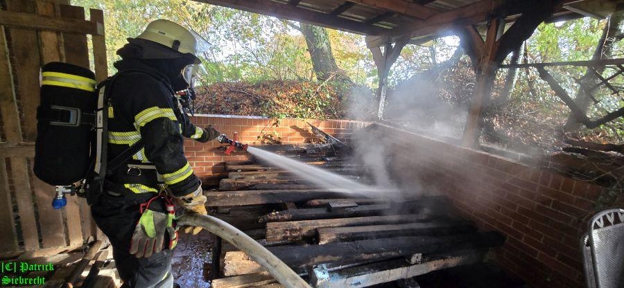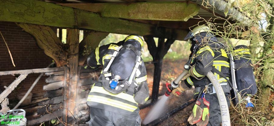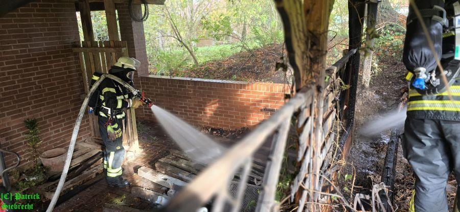 Aus noch ungeklärter Ursache war ein Brand in einem Carport, der an eine Garage angrenzt, ausgebrochen. Nachbarn sahen eine Rauchwolke und informierten die Mieterin auf dem Grundstück. Beim Eintreffen der Einsatzkräfte brannte in dem Carport gelagertes Material sowie die Holzverkleidung, außerhalb des Carports brannte bereits etwas Vegetation.