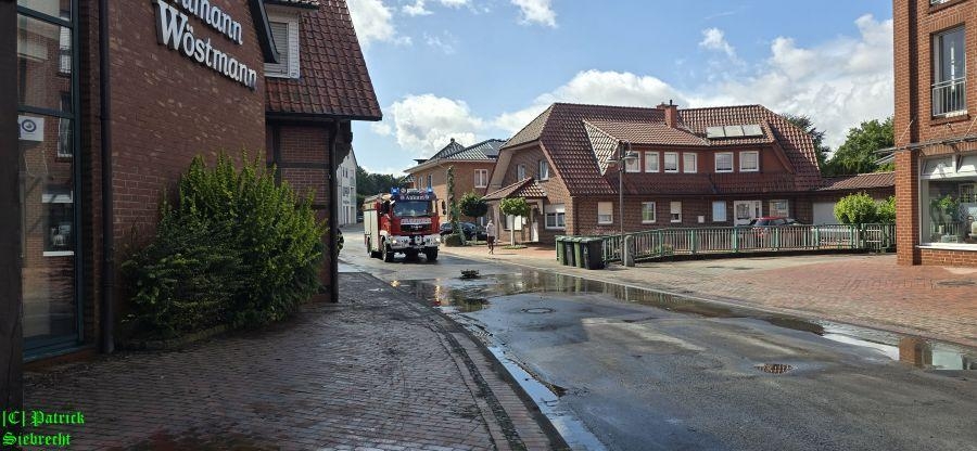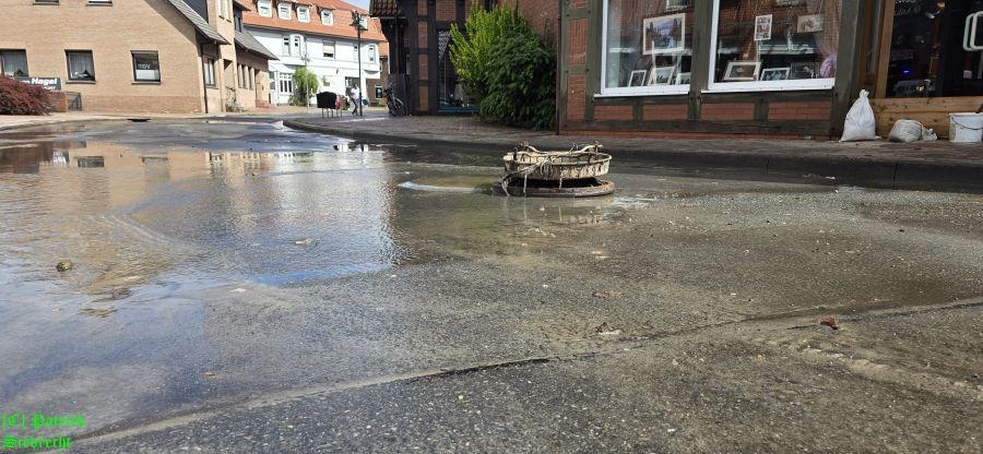 Wir sperrten zunächst die Hauptstraße sowie die Druchhorner Straße für den Verkehr und begannen damit Gullis und Kanalschächte zu öffnen um den Abfluss zu beschleunigen.