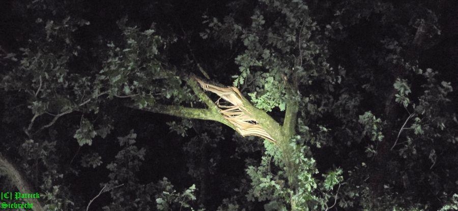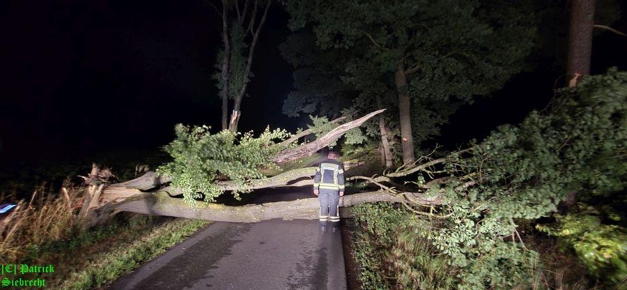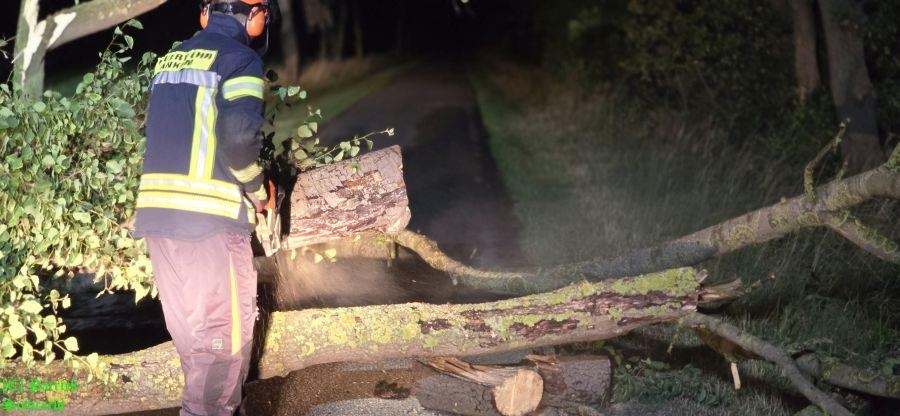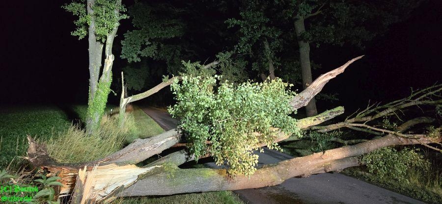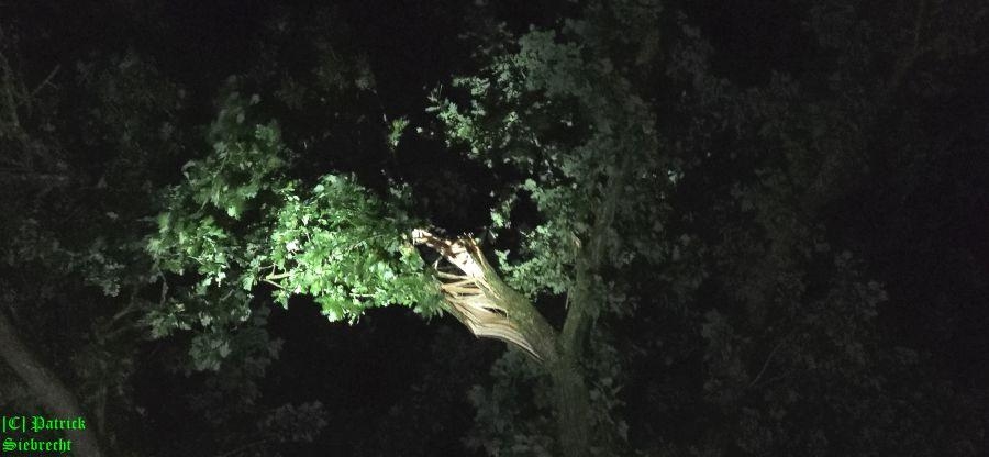 Es lagen mehrere Bäume und Äste auf der Straße die entfernt wurden. Von der Drehleiter heraus wurden lose und angebrochene Äste aus Bäumen entfernt.