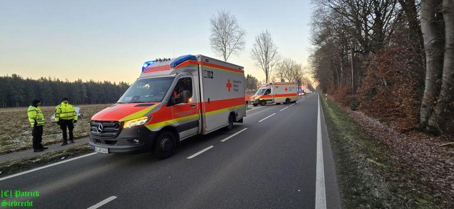 Bei unserem Eintreffen waren Rettungsdienst und Polizei bereits vor Ort. Rechts, in Richtung Merzen, stand auf einem Acker ein beschädigter BMW, in Fahrtrichtung Ankum, lag ein Audi auf der Beifahrerseite zwischen 2 Bäumen. Beide Fahrer hatten bereits ihre Fahrzeuge verlassen und wurden vom Rettungsdienst untersucht. Laut Aussage der Polizei, beabsichtigte der Fahrer des BMW von einer Seitenstraße aus auf den Voltlager Damm in Richtung Ankum zu fahren Hierbei übersah dieser den aus Richtung Merzen kommenden Audi. Es folgte ein Zusammenstoß, wobei der BMW auf den Acker gelenkt wurde. Der Audi geriet nach rechts von der Straße ab, prallte gegen einen Baum und kippte auf die Beifahrerseite. Nach Einschätzung des Rettungsdienstes blieben beide Fahrer unverletzt, wobei der Fahrer des Audis trotzdem in ein Krankenhaus gebracht wurde.