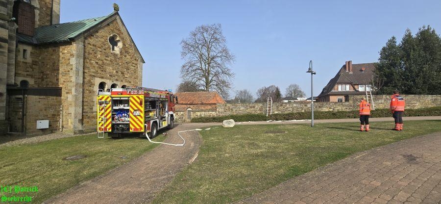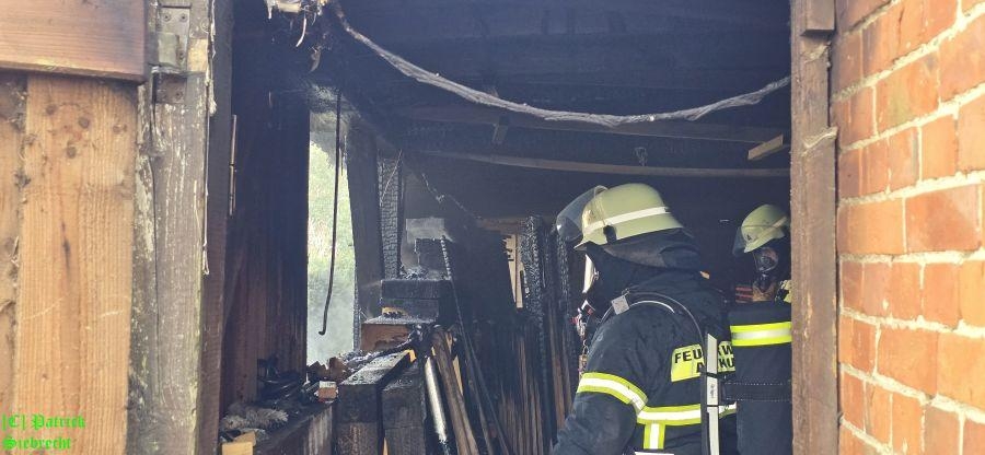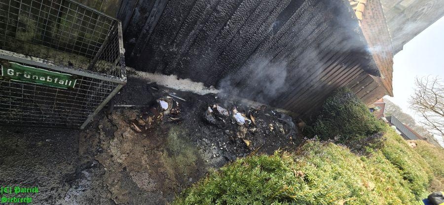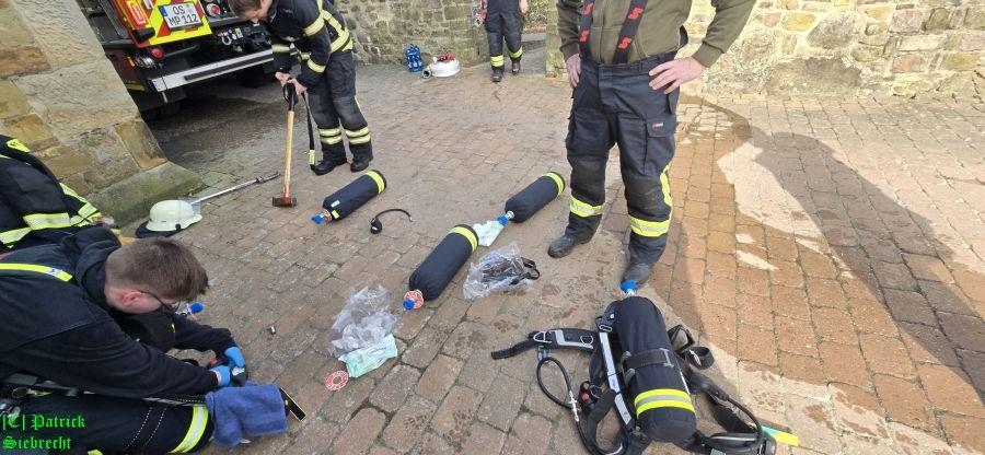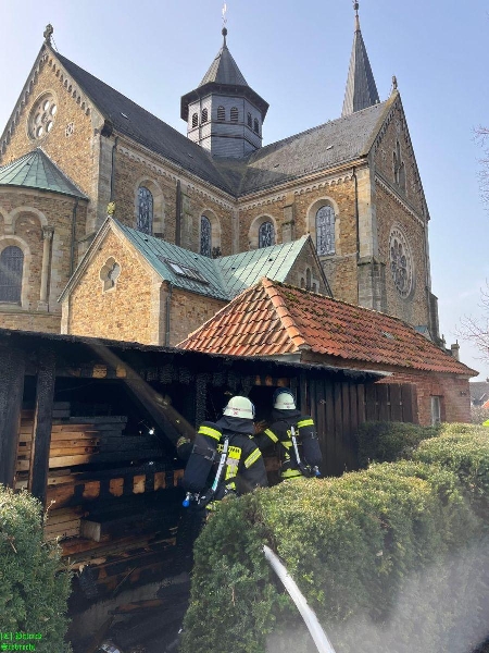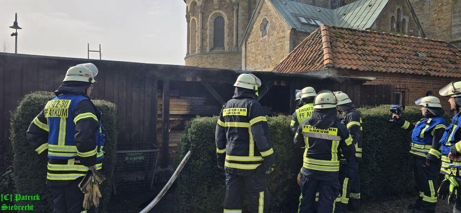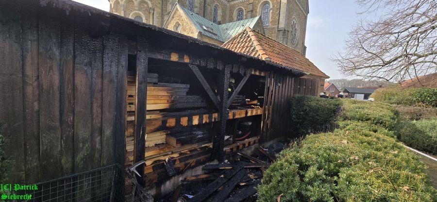 Um 11:16 Uhr wurden wir gemeinsam mit dem Rettungsdienst und der Polizei zu einem gemeldeten Schuppenbrand "An der Kirchenburg" alarmiert. Bei unserem Eintreffen am Einsatzort fanden wir einen in Brand geratenen Schuppen der zum "Artländer Dom" gehört, vor. Im Außenbereich am Schuppen brannten Mülltonnen und das Feuer war bereits durch die hölzerne Verkleidung des Schuppens gebrannt und hatte auf dort gelagerte Utensilien übergriffen. Insgesamt wurden drei Trupps unter schwerem Atemschutz mit 2 handgeführten Strahlrohren eingesetzt. Nachdem der Brand eingedämmt werden konnte, begannen aufwendige Nachlöscharbeiten. Hierbei wurden vom Brand betroffene Utensilien auf eine Freifläche gebracht und teilweise die Holzverkleidung geöffnet bzw. entfernt. Die Polizei geht derzeit davon aus, dass der Brand im Bereich der Mülltonnen ausgebrochen ist. Die Polizei hat die Ermittlungen zur Brandursache noch während der Löscharbeiten aufgenommen. Wir bedanken uns bei Pfarrer Franke und seinem Team für das bereitstellen von Getränken.