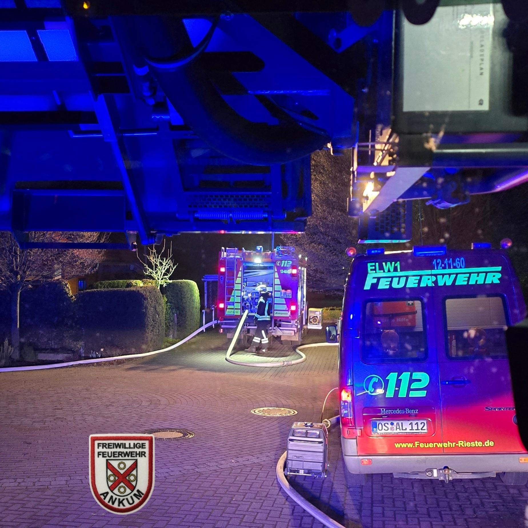Wir wurden am frühen Donnerstagmorgen um 03:33 Uhr mit der Drehleitereinheit zur Unterstützung der Feuerwehr Rieste an der Straße "Auf den Fiening" alarmiert. Eine PKW brannte vor einer Garage und die Flammen hatten bereits auf den Dachstuhl der Garage übergegriffen. Die Kameradinnen und Kameraden der Feuerwehren aus Rieste und Alfhausen hatten die Lage bei unserem Eintreffen unter Kontrolle. Wir öffneten von der Drehleiter aus die Dachhaut der Garage um letzte Glutnester ablöschen zu können. Gegen 05:15 Uhr war der Einsatz mit dem Einrücken der Drehleiter beendet. Die Polizei hat die Ermittlungen zur Brandursache aufgenommen.